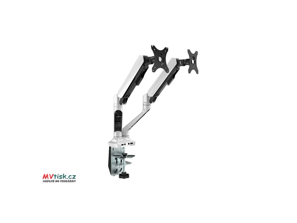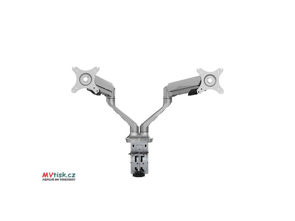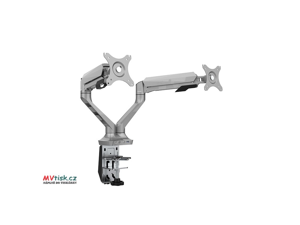 Polohovatelný držák pro 2 monitory, 2-9KG, svorka a průchodka stolu, 17"-30", USB HUB + Jack, 75x75/100x100, šedý