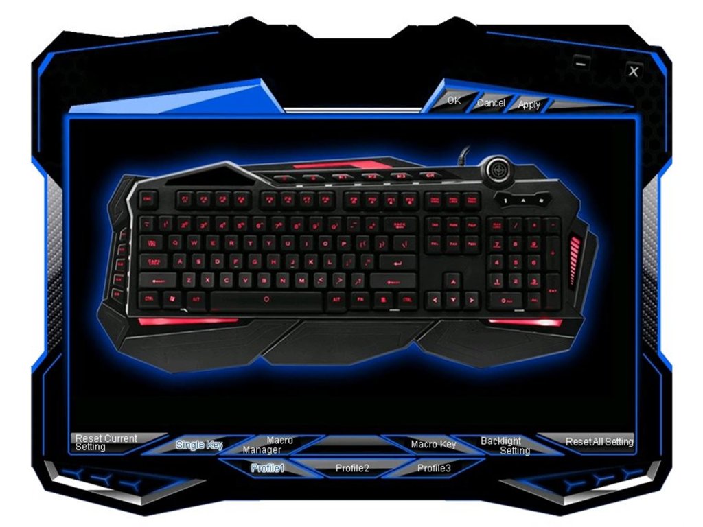 3 profily - na klávesnici naleznete klávesy pro přepínání mezi 3 nezávislými profily. Pro každý profil lze individuálně nastavit barva podsvícení, její intenzita, makra, předefinované klávesy...