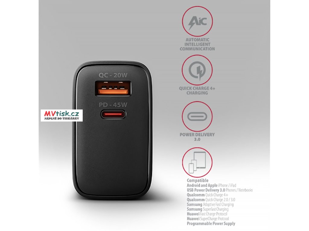 • PD - rychlé nabíjení (až 45W) Apple iPad mini, iPad Air, iPad Pro, MacBook Air a dalších ultrabooků.