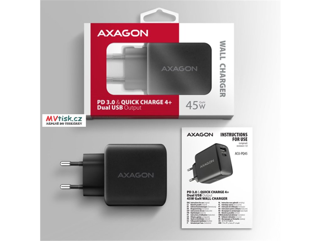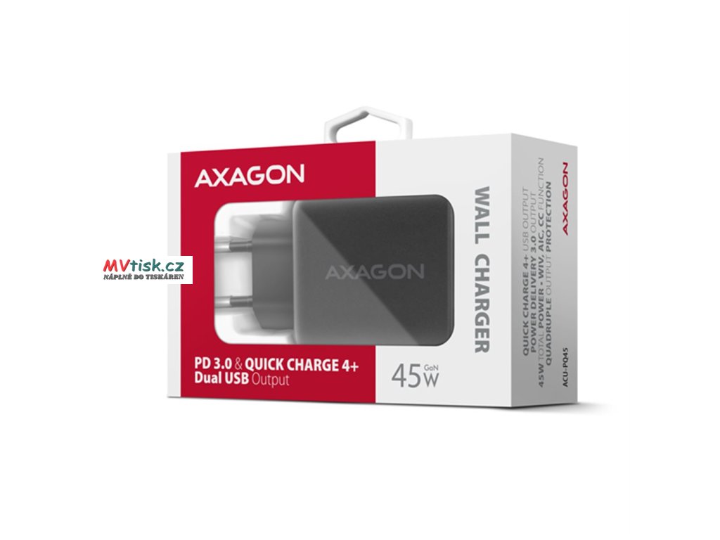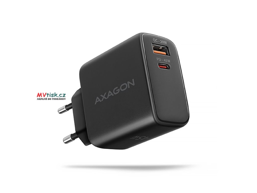 AXAGON ACU-PQ45 GaN nabíječka do sítě 45W, 2x port (USB-A + USB-C), PD3.0/PPS/QC4+/SFC 2.0/AFC/Apple